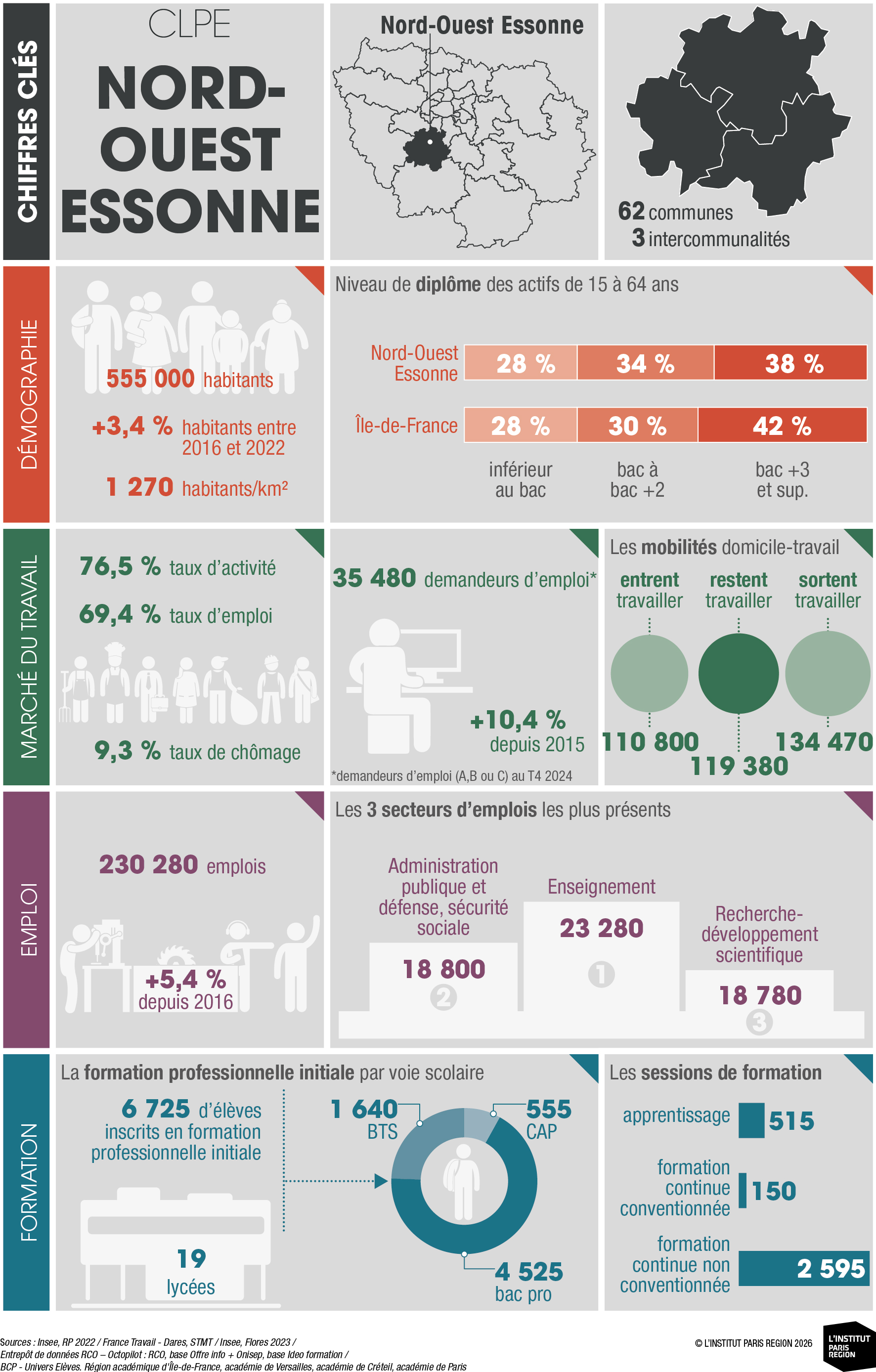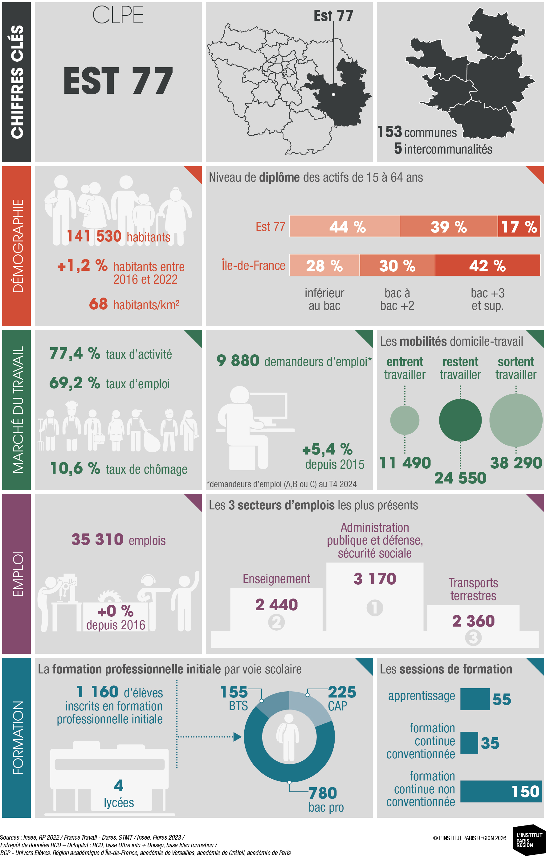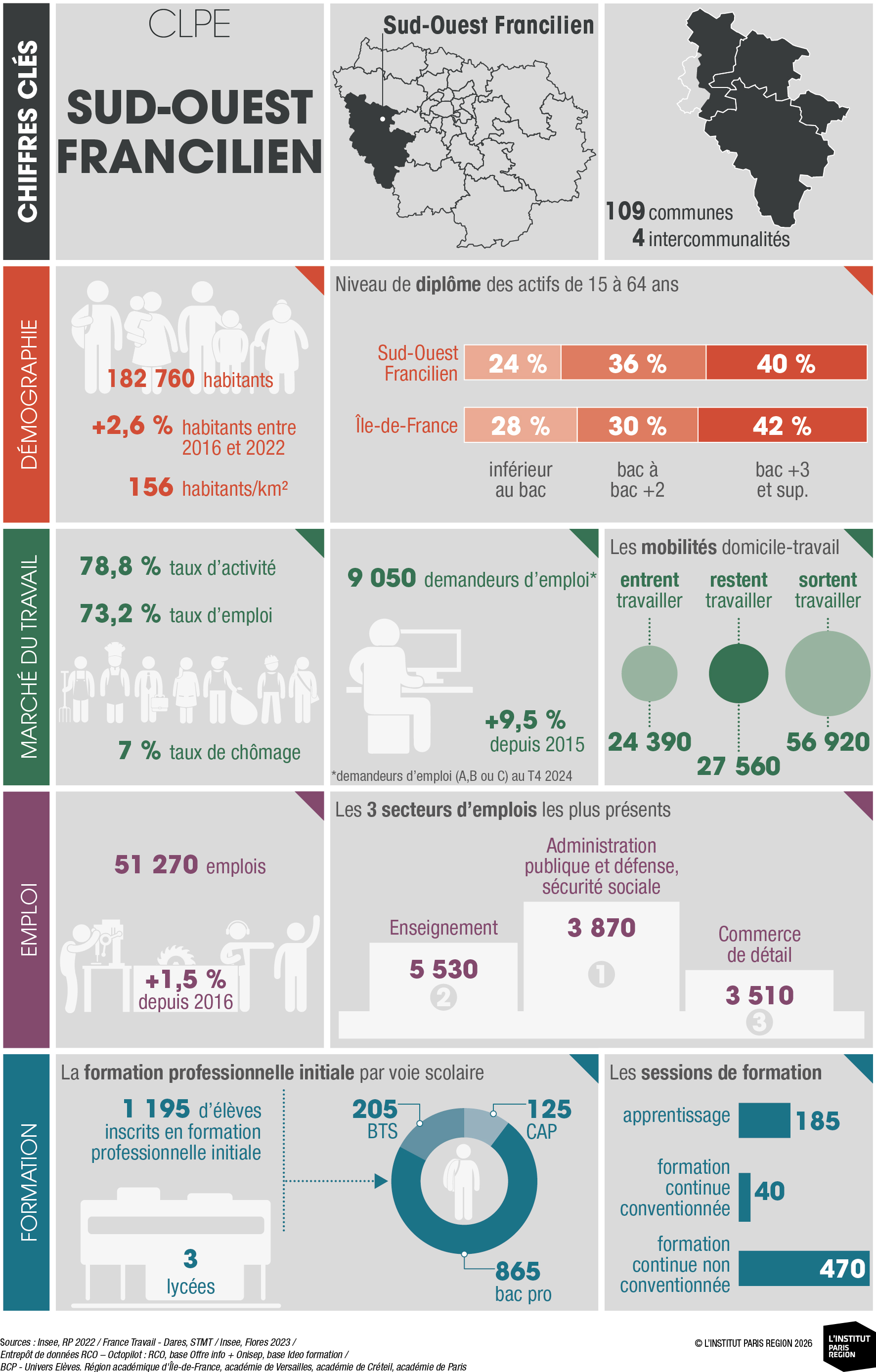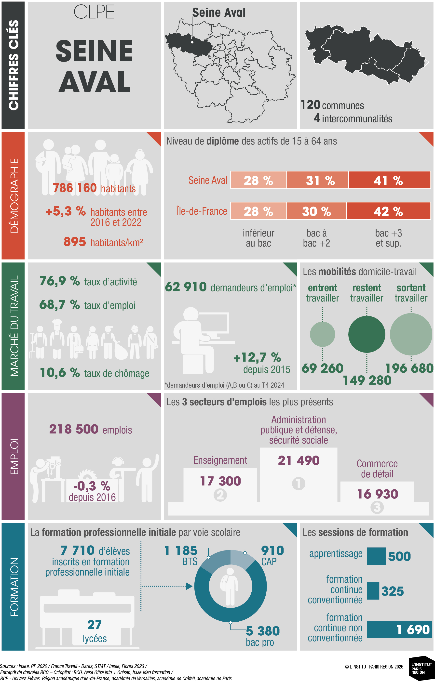 À destination des acteurs économiques et du champ emploi-formation, ces portraits éclairent les dynamiques locales et constituent un outil d’aide à la décision. Ils rassemblent des indicateurs clés couvrant les principales dimensions des territoires – sociodémographie, marché du travail, tissu économique et formation professionnelle – élaborés à partir de sources de données consolidées avec l’appui du Réseau des Carif-Oref (RCO), et sont composés d’analyses commentées, de tableaux, de graphiques et de cartes. Ces portraits offrent ainsi une lecture complète et comparative des 26 CLPE franciliens, au regard de la région et de la France métropolitaine.