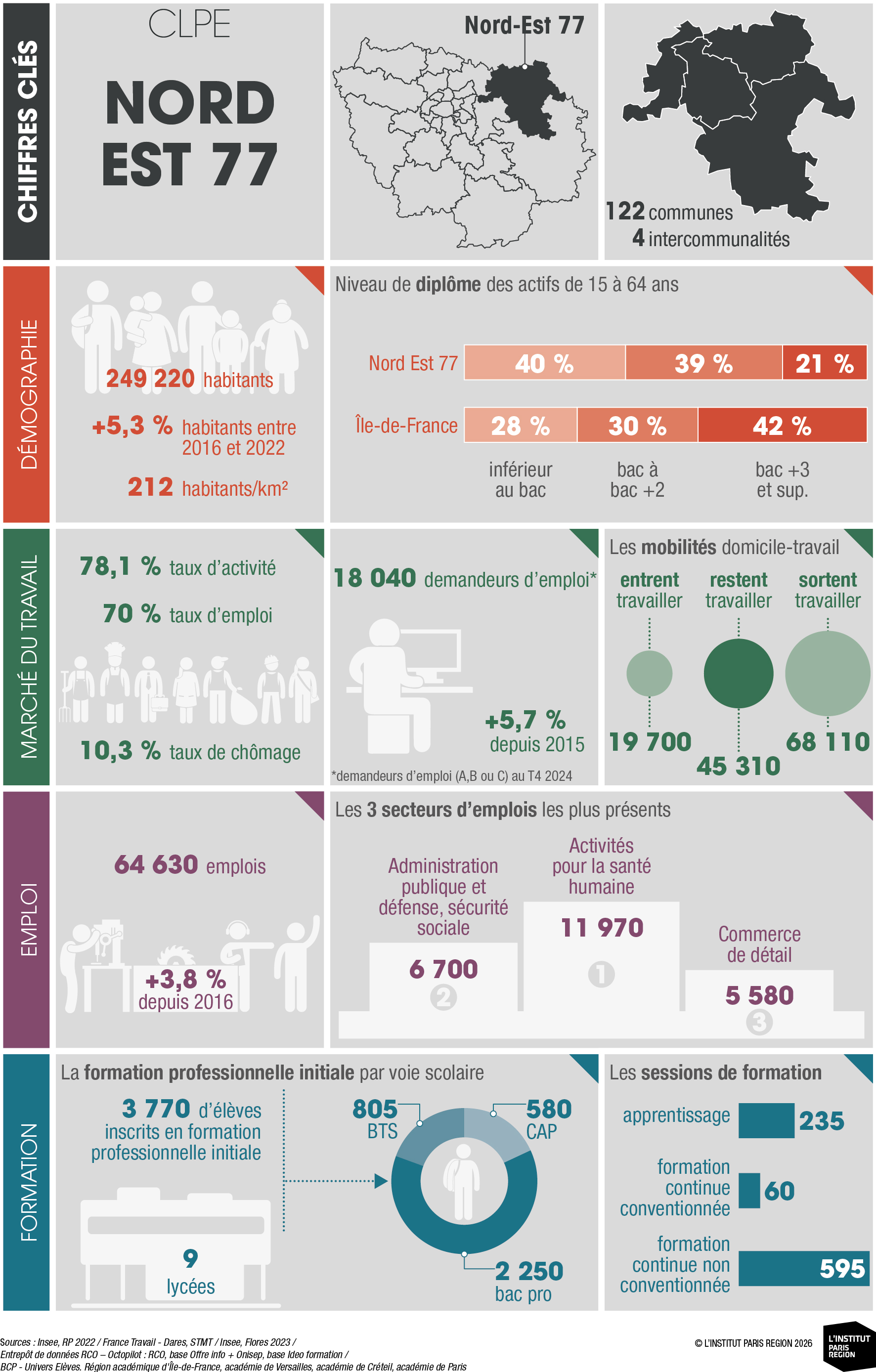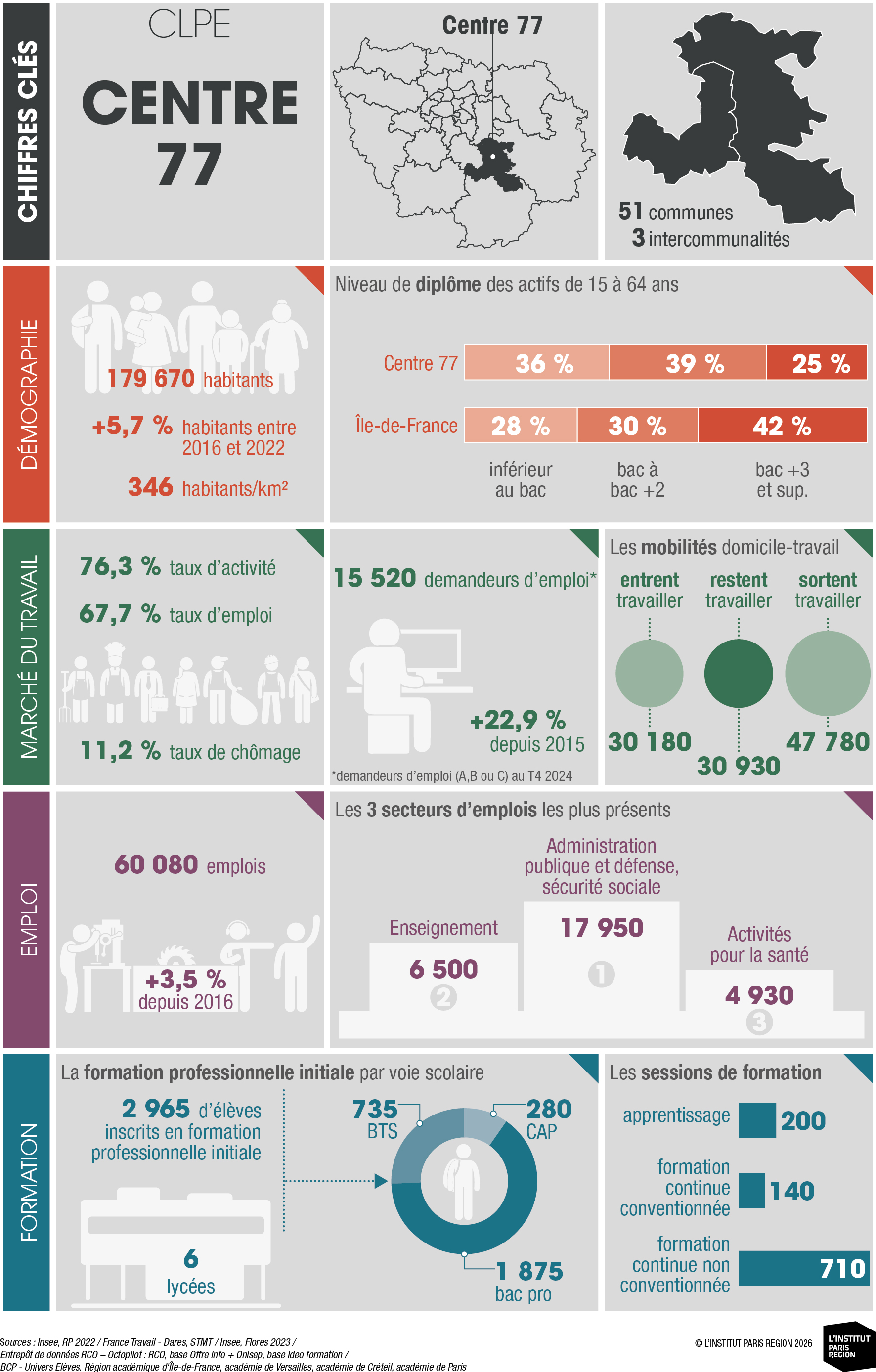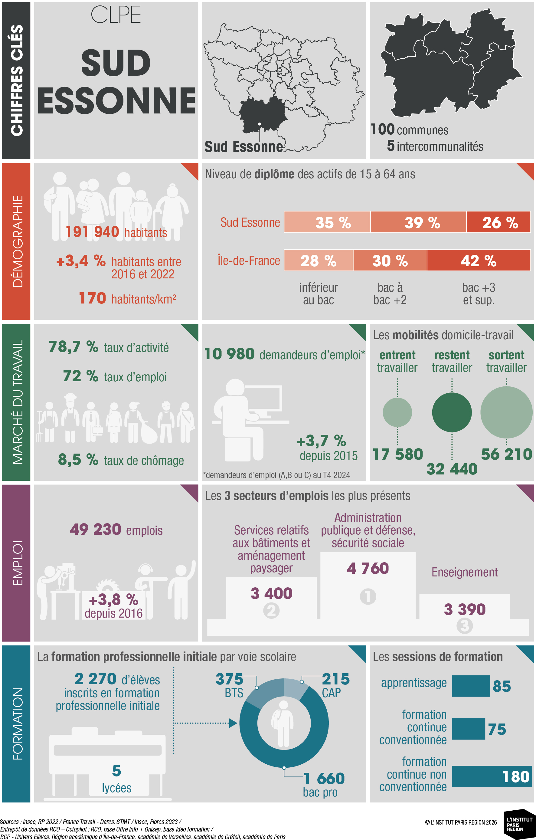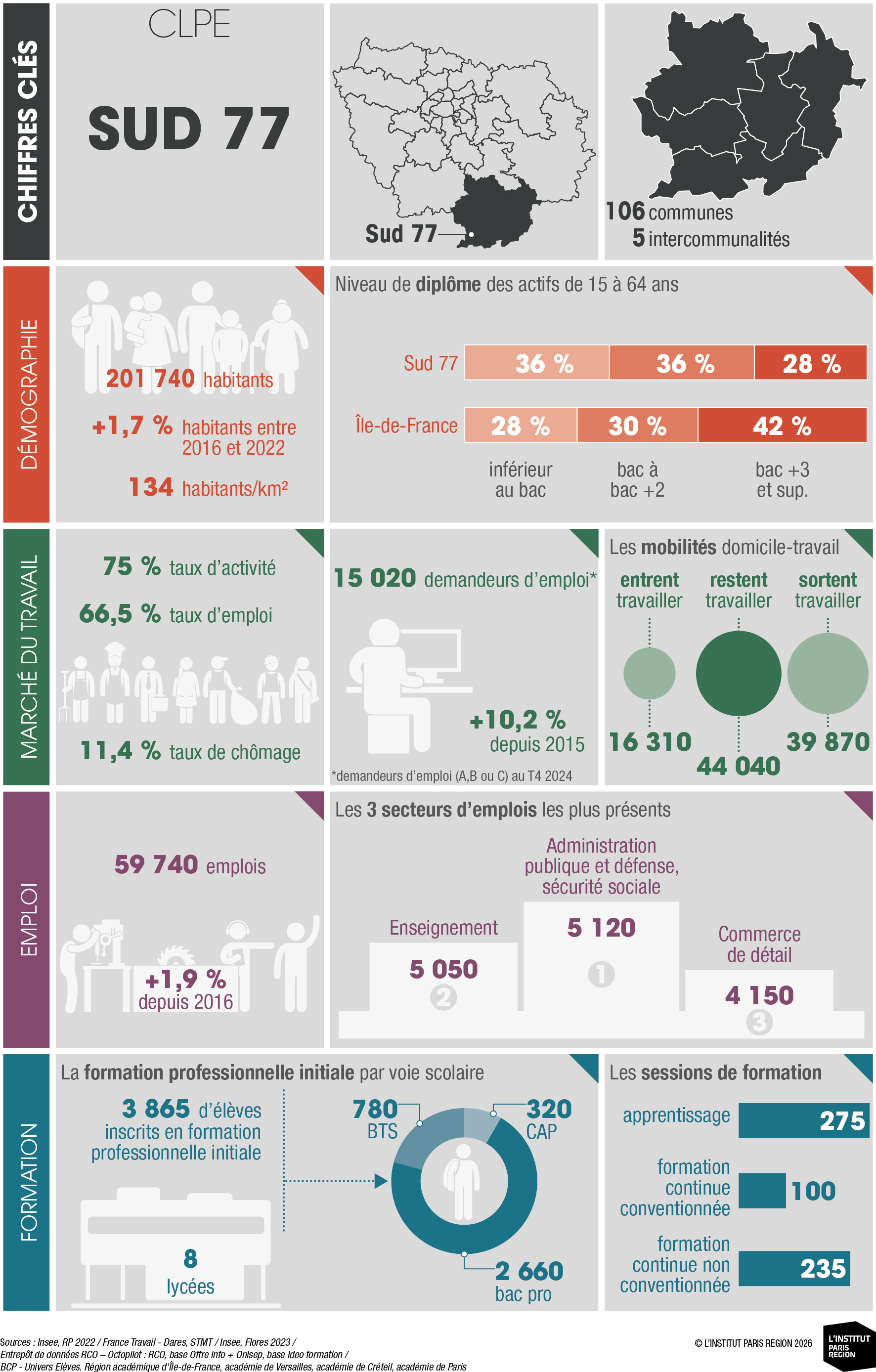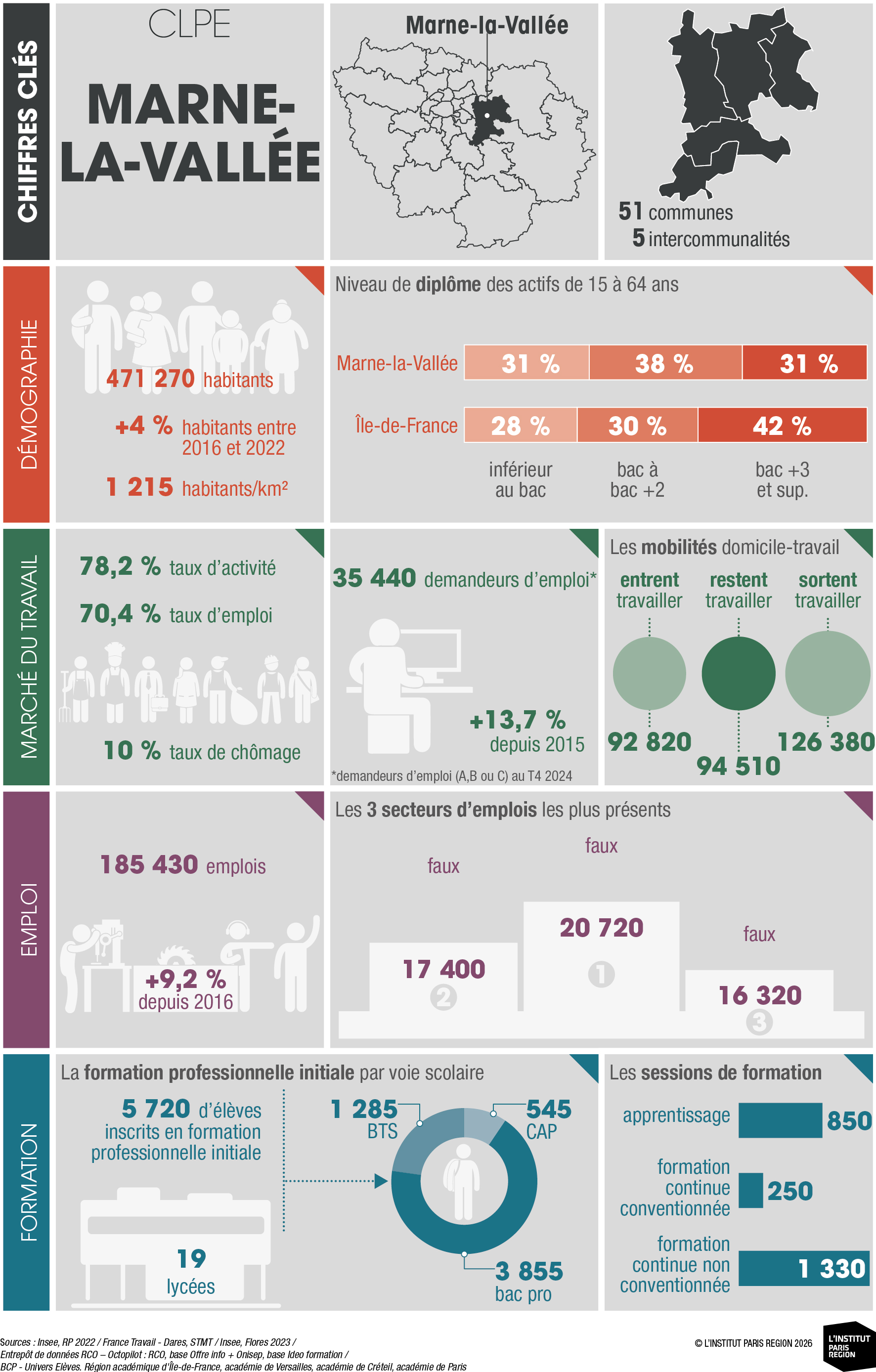 À destination des acteurs économiques et du champ emploi-formation, ces portraits éclairent les dynamiques locales et constituent un outil d’aide à la décision. Ils rassemblent des indicateurs clés couvrant les principales dimensions des territoires – sociodémographie, marché du travail, tissu économique et formation professionnelle – élaborés à partir de sources de données consolidées avec l’appui du Réseau des Carif-Oref (RCO), et sont composés d’analyses commentées, de tableaux, de graphiques et de cartes. Ces portraits offrent ainsi une lecture complète et comparative des 26 CLPE franciliens, au regard de la région et de la France métropolitaine.