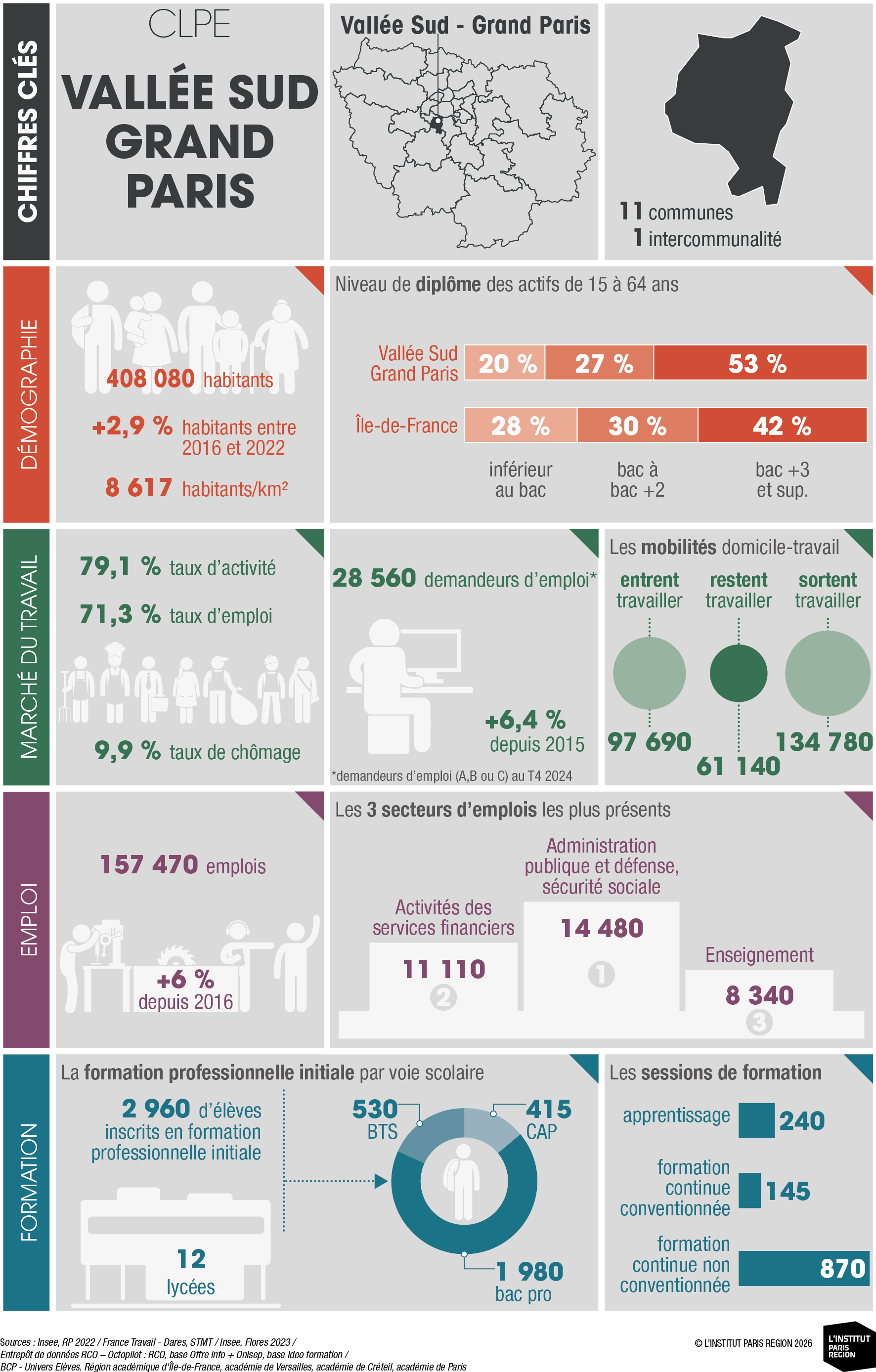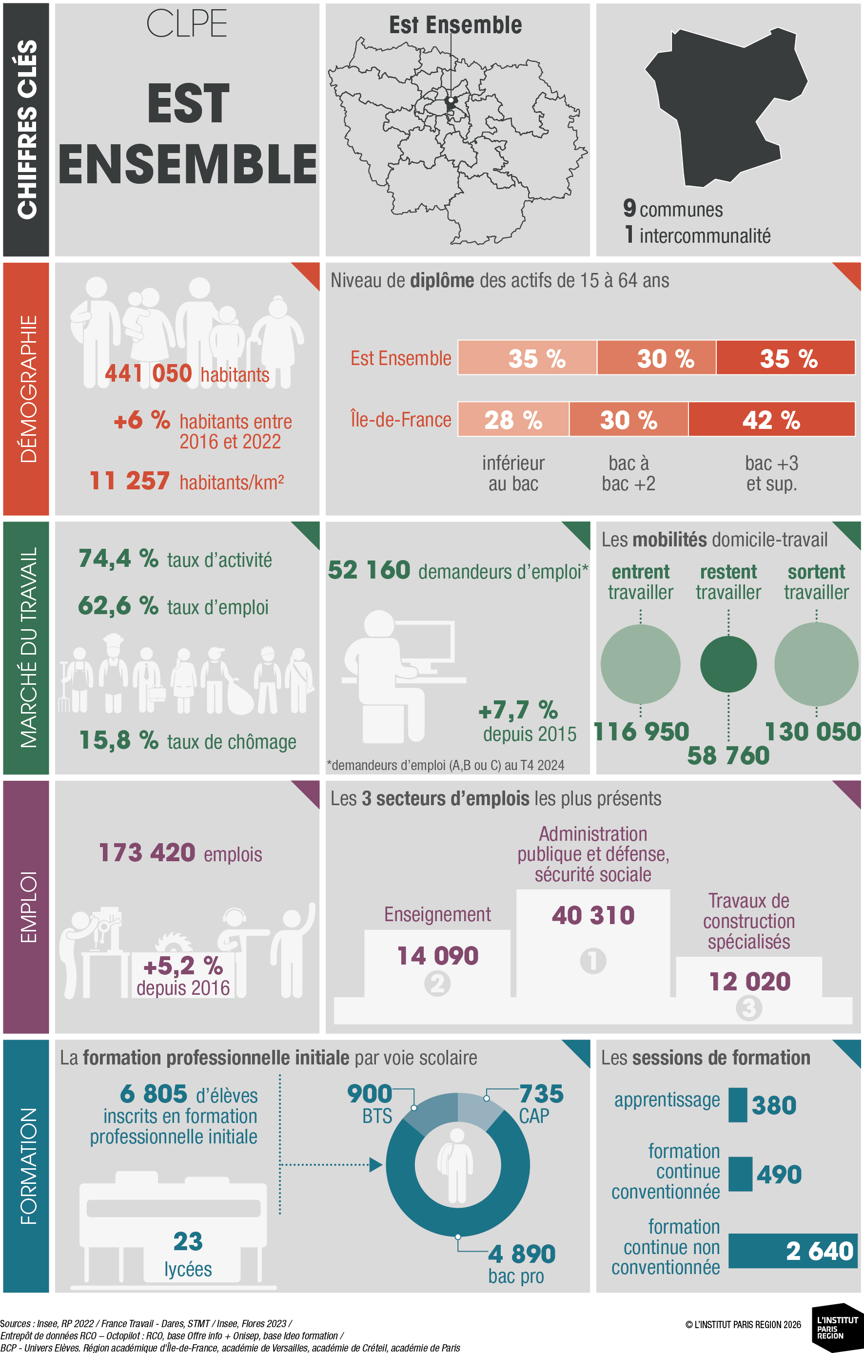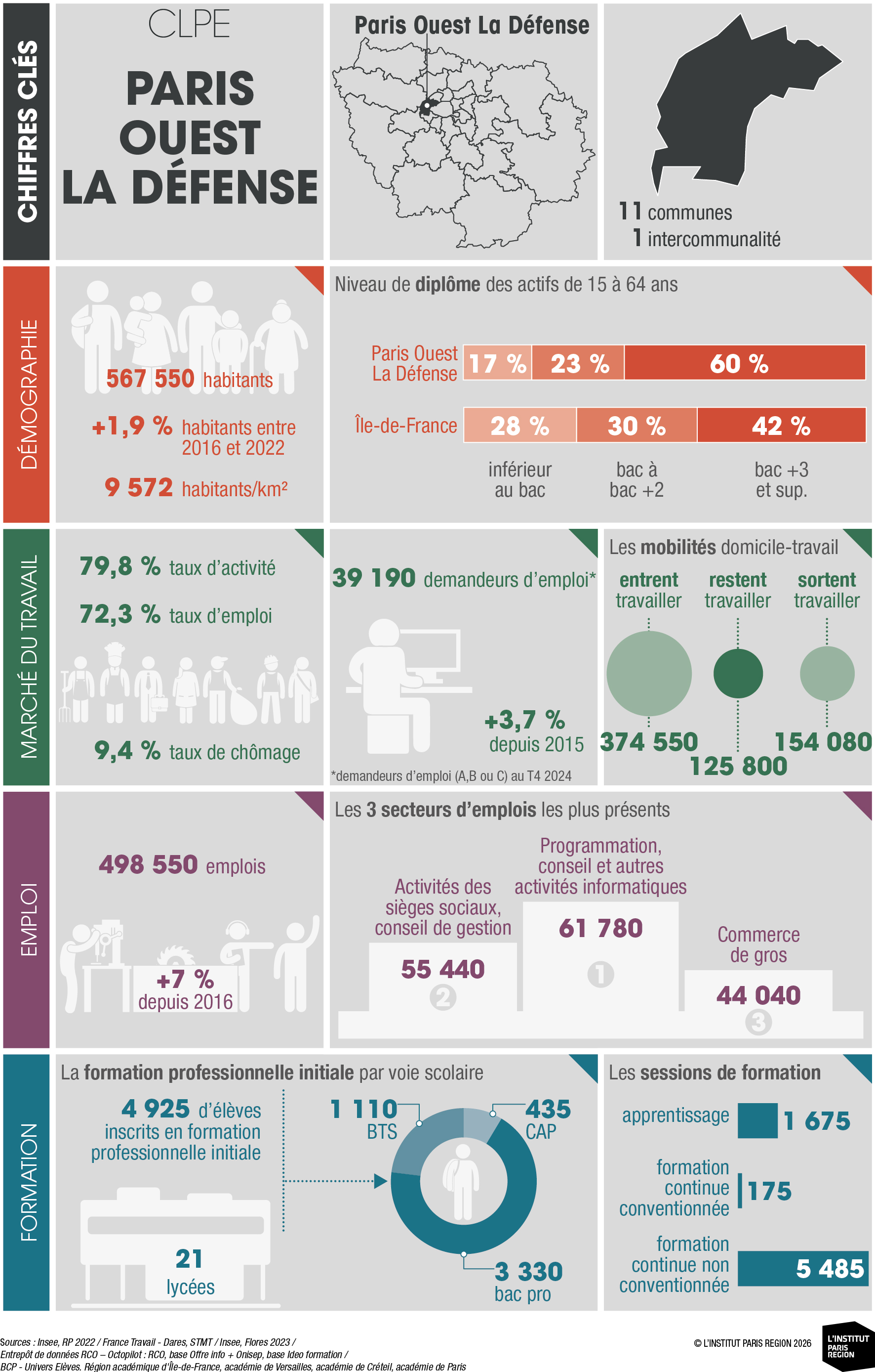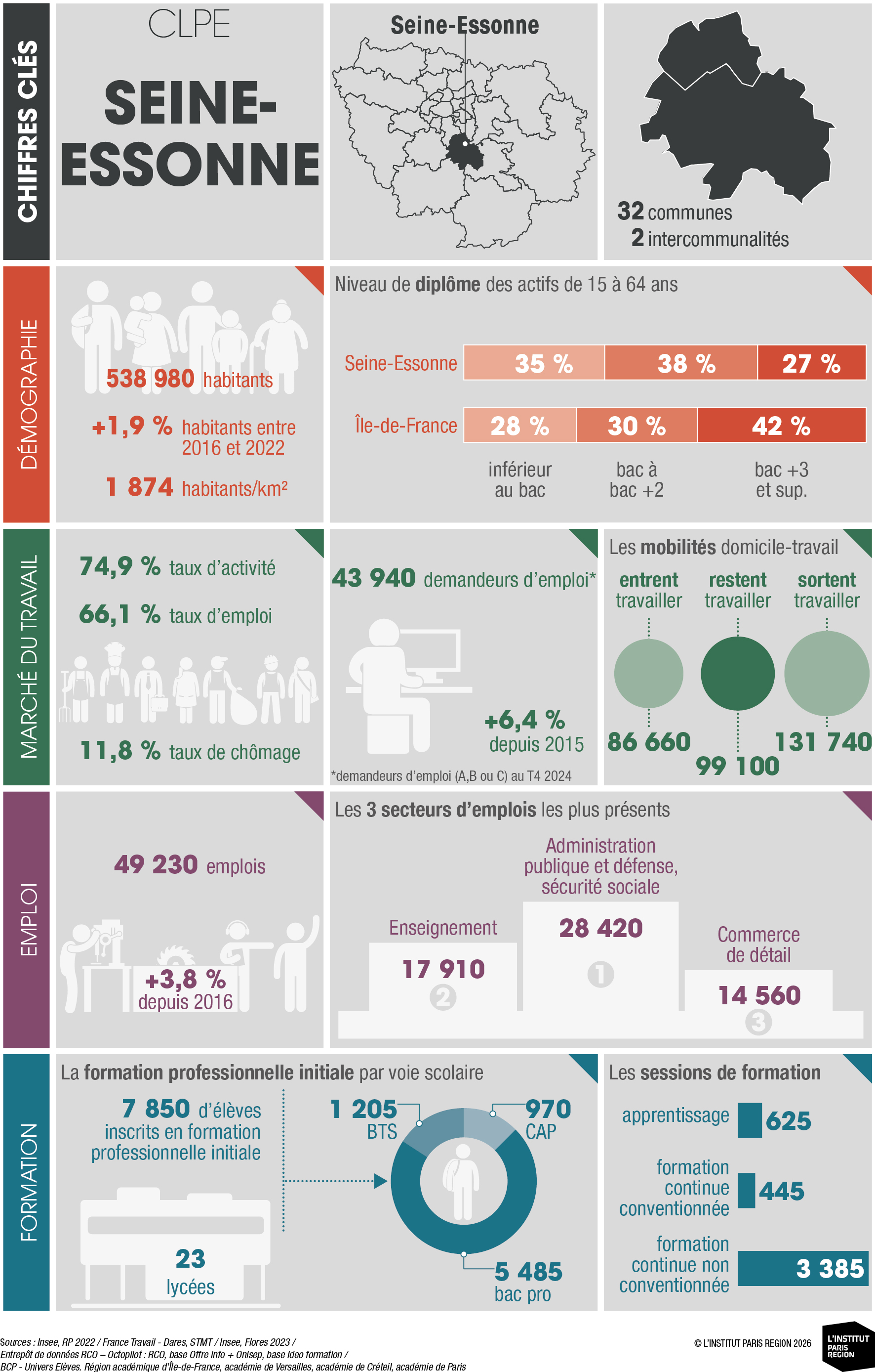 À destination des acteurs économiques et du champ emploi-formation, ces portraits éclairent les dynamiques locales et constituent un outil d’aide à la décision. Ils rassemblent des indicateurs clés couvrant les principales dimensions des territoires – sociodémographie, marché du travail, tissu économique et formation professionnelle – élaborés à partir de sources de données consolidées avec l’appui du Réseau des Carif-Oref (RCO), et sont composés d’analyses commentées, de tableaux, de graphiques et de cartes. Ces portraits offrent ainsi une lecture complète et comparative des 26 CLPE franciliens, au regard de la région et de la France métropolitaine.