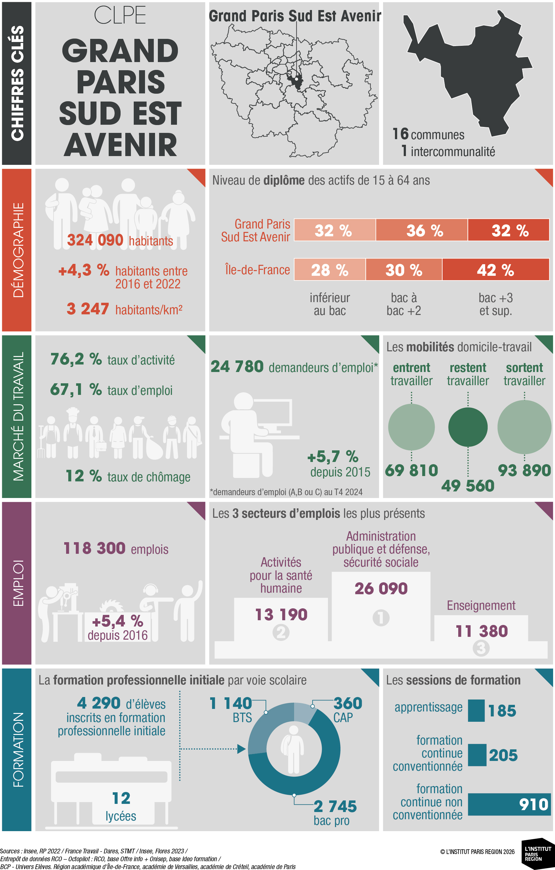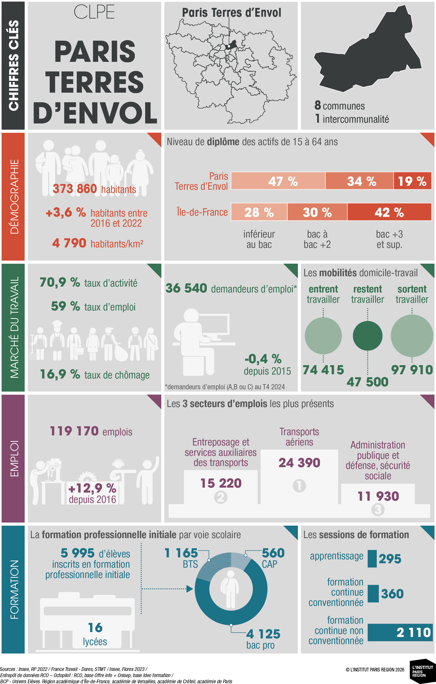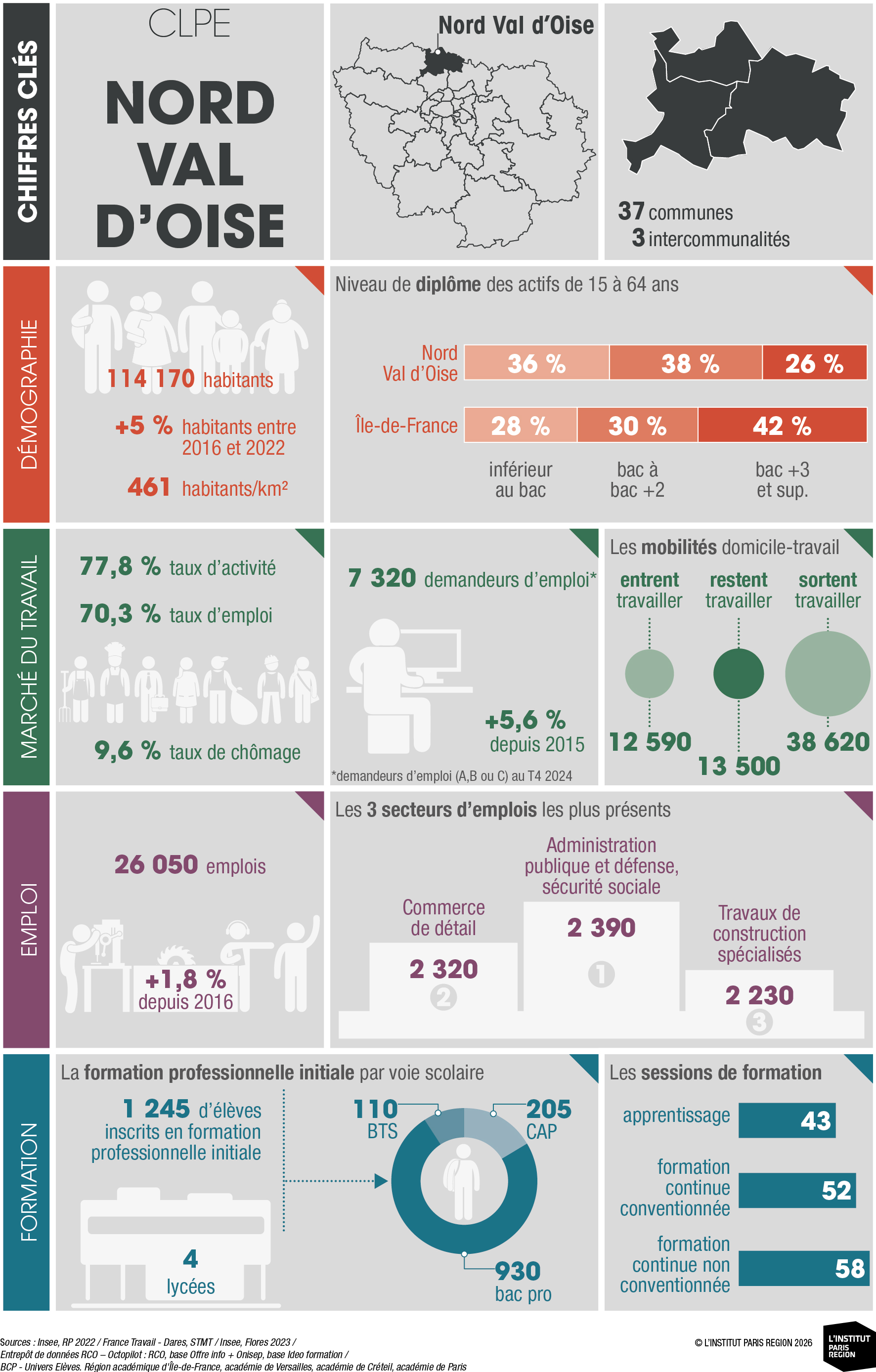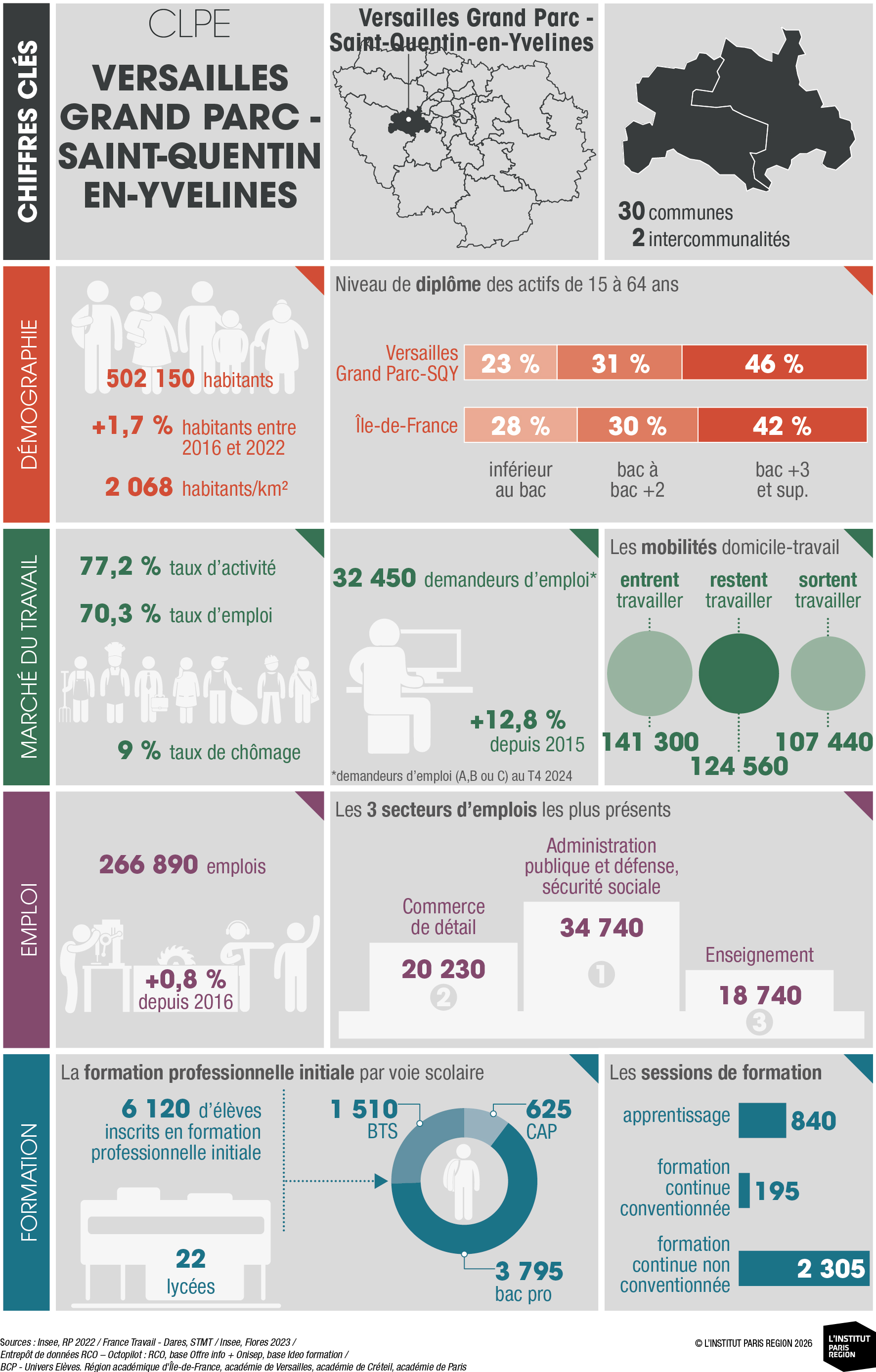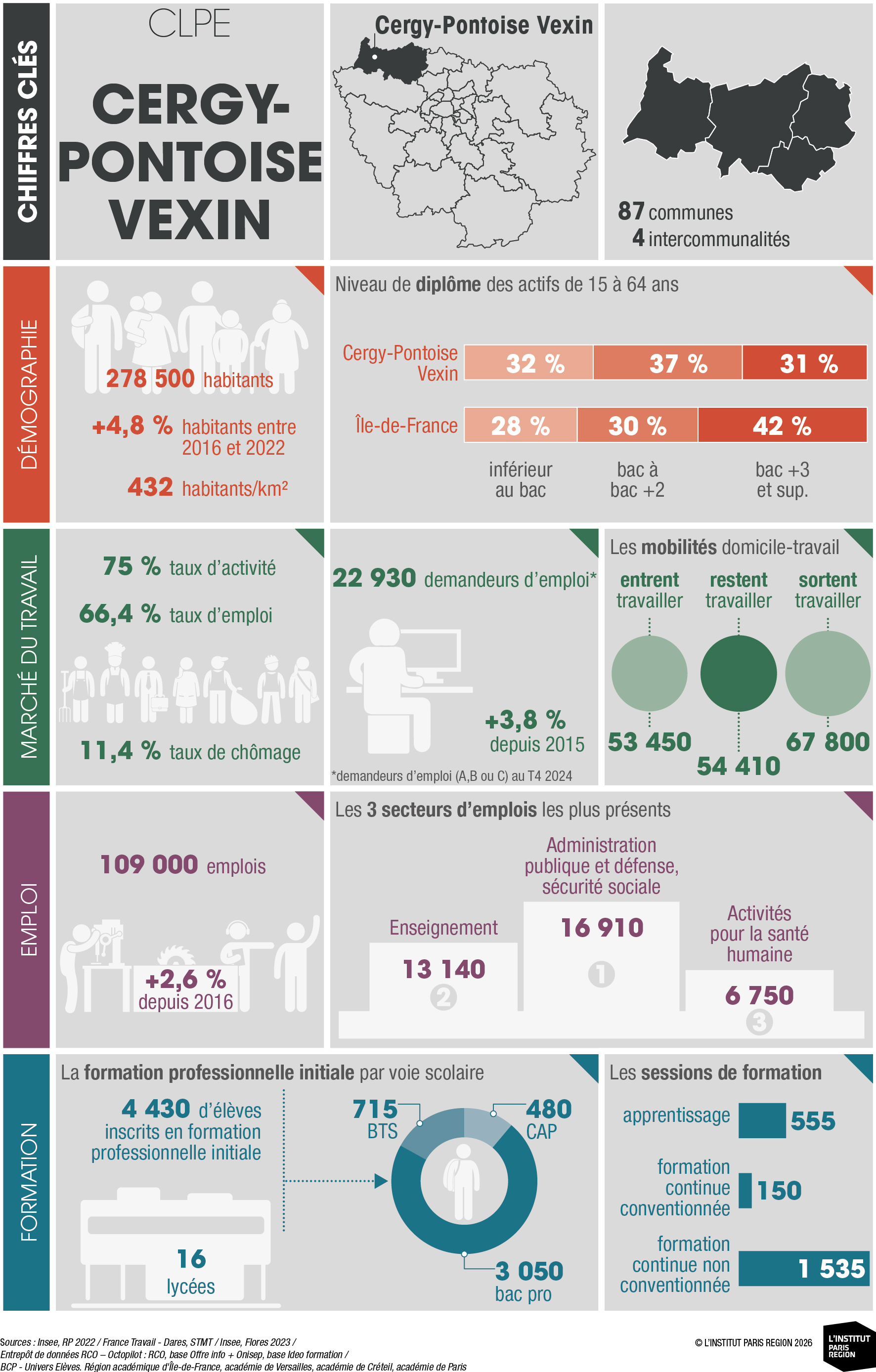 À destination des acteurs économiques et du champ emploi-formation, ces portraits éclairent les dynamiques locales et constituent un outil d’aide à la décision. Ils rassemblent des indicateurs clés couvrant les principales dimensions des territoires – sociodémographie, marché du travail, tissu économique et formation professionnelle – élaborés à partir de sources de données consolidées avec l’appui du Réseau des Carif-Oref (RCO), et sont composés d’analyses commentées, de tableaux, de graphiques et de cartes. Ces portraits offrent ainsi une lecture complète et comparative des 26 CLPE franciliens, au regard de la région et de la France métropolitaine.