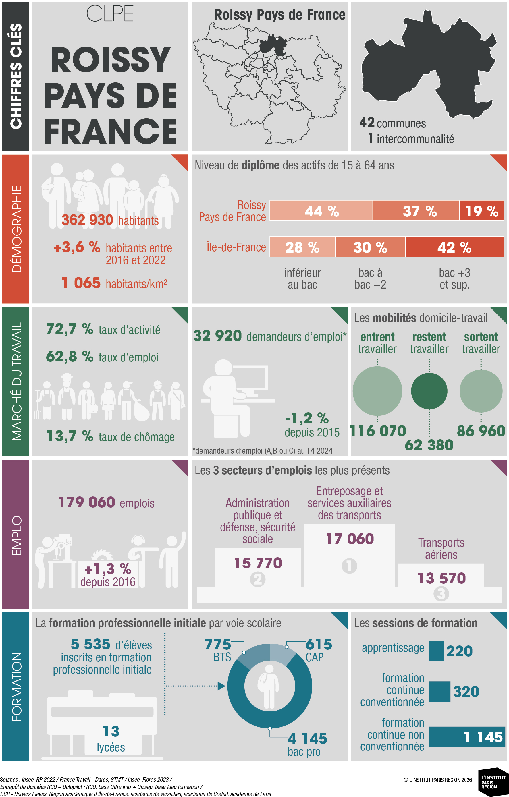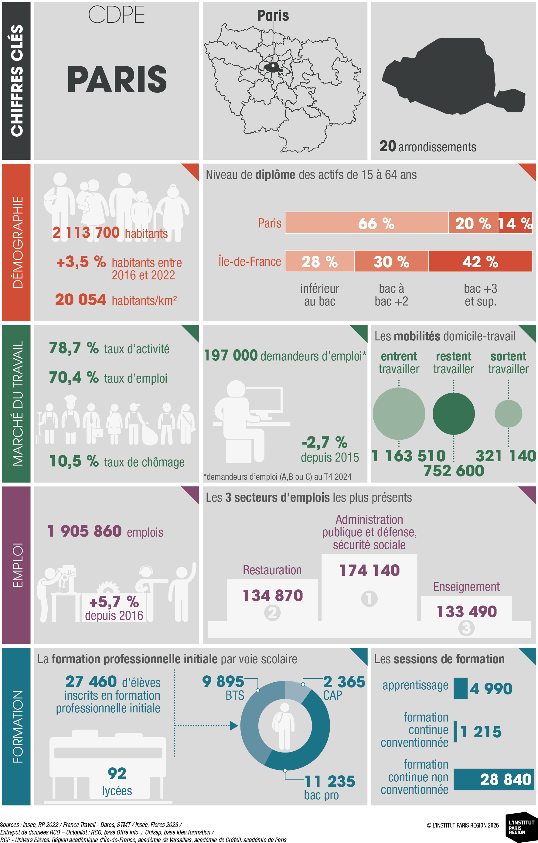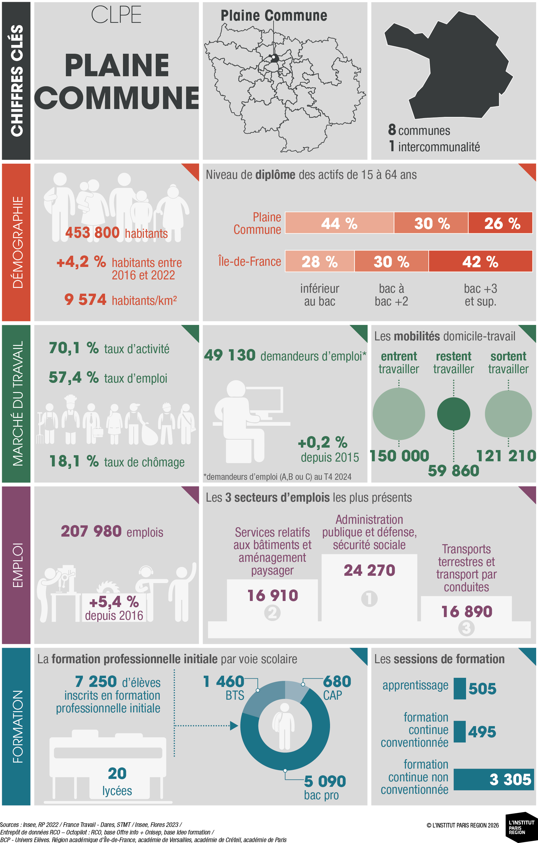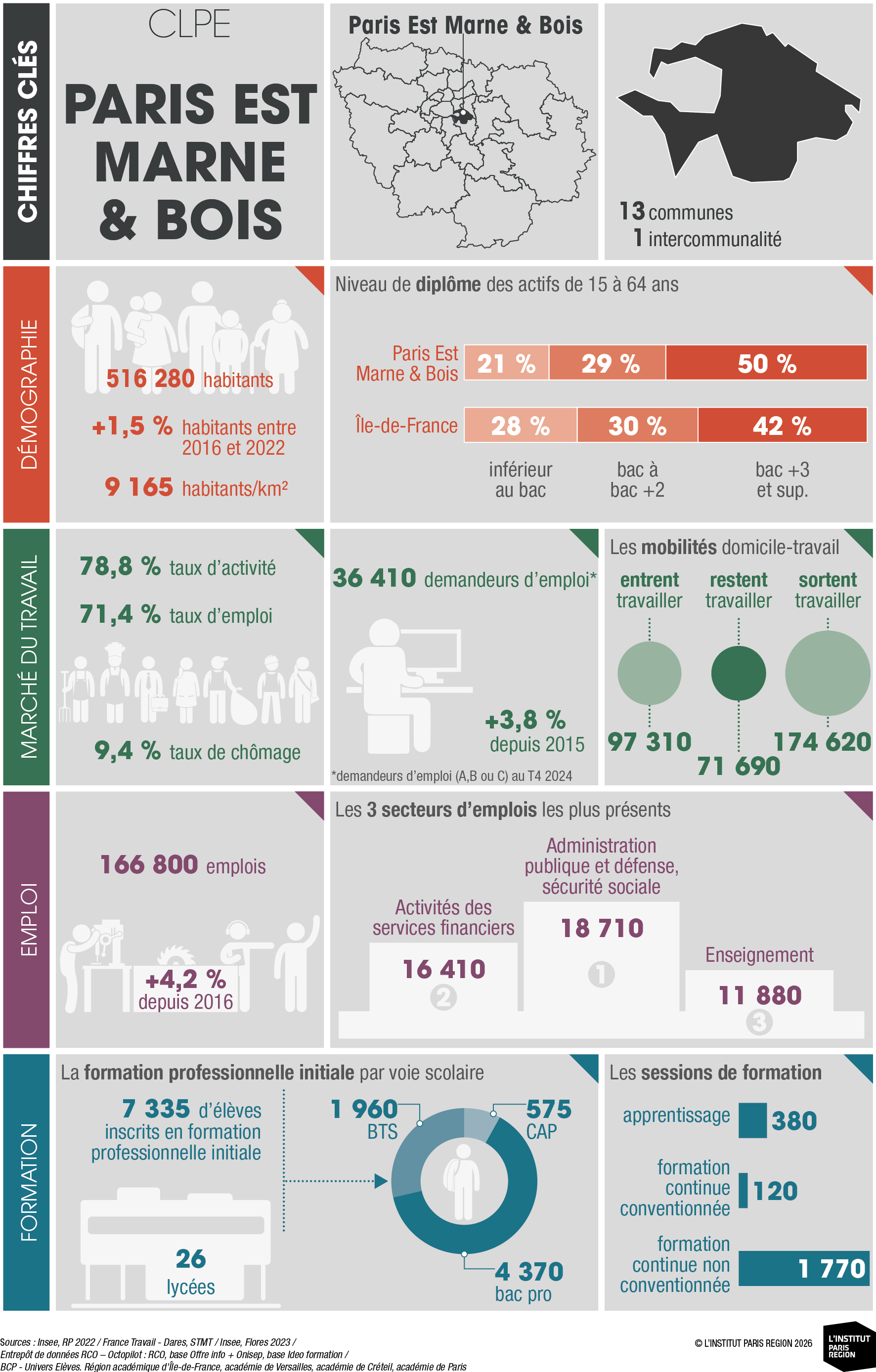 À destination des acteurs économiques et du champ emploi-formation, ces portraits éclairent les dynamiques locales et constituent un outil d’aide à la décision. Ils rassemblent des indicateurs clés couvrant les principales dimensions des territoires – sociodémographie, marché du travail, tissu économique et formation professionnelle – élaborés à partir de sources de données consolidées avec l’appui du Réseau des Carif-Oref (RCO), et sont composés d’analyses commentées, de tableaux, de graphiques et de cartes. Ces portraits offrent ainsi une lecture complète et comparative des 26 CLPE franciliens, au regard de la région et de la France métropolitaine.