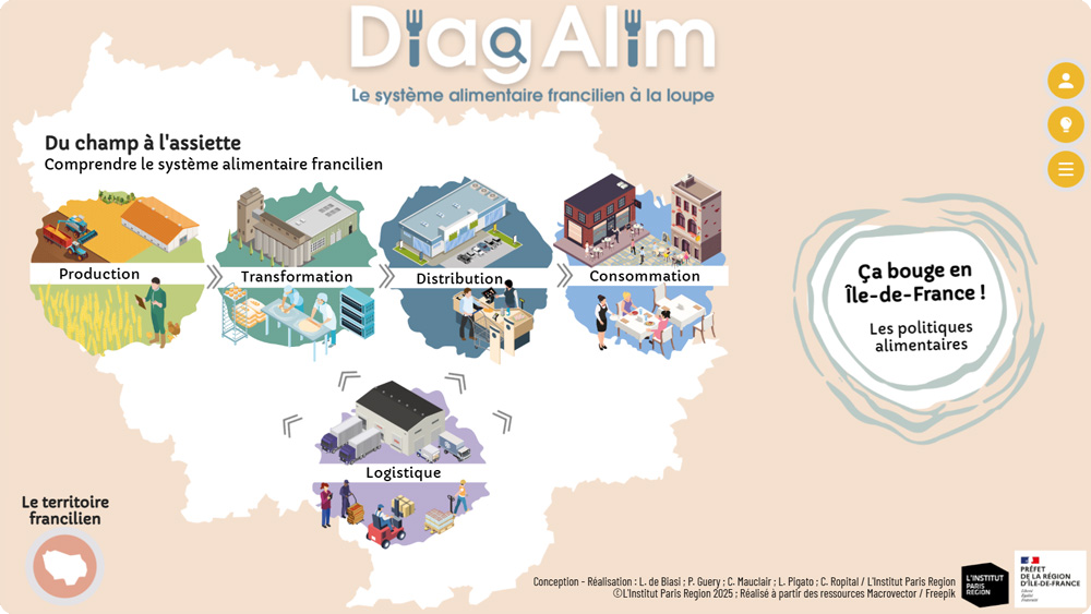 DiagAlim est un outil interactif visant à présenter de façon synthétique et pédagogique les principales caractéristiques du système alimentaire francilien. Que vous soyez élu, technicien, chercheur, apprenant ou citoyen, ce support vise à enrichir vos réflexions, favoriser le partage de connaissances et le dialogue entre acteurs du territoire.