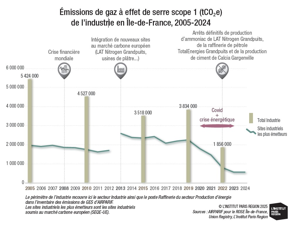 Les données d’émissions de GES de sites industriels franciliens fournies ici proviennent du Registre de l’Union européenne des émissions de GES des installations soumises au marché carbone européen : le système d’échange de quotas d’émissions de l’UE (SEQE-UE, ou EU ETS en anglais). En place depuis 2005, ce système concerne les principaux sites émetteurs de GES dans les secteurs de la production d’énergie (électricité et chaleur) et de l’industrie lourde, soit environ 10 000 installations en Europe, auxquelles s’ajoutent, depuis 2012, les compagnies aériennes opérant au sein de l’UE et, depuis 2024, une partie du transport maritime. Il couvre environ 40 % des émissions totales de GES de l’UE. Les installations soumises au SEQE-UE doivent déclarer chaque année leurs émissions directes de GES (principalement de CO2) de l’année civile précédente. Cela permet un suivi précis de leurs émissions annuelles directes, site par site, jusqu’à l’année n-1. Les sites industriels franciliens concernés étaient 42 en 2013 – année de l’élargissement du SEQE-UE à davantage de secteurs industriels qu’à sa création en 2005 – et plus que 25 en 2024. S’ils ne représentent qu’une toute petite fraction des plus de 18 000 établissements industriels que compte l’Île-de-France, ils sont responsables d’une part importante – quoique décroissante – des émissions directes totales de l’industrie francilienne : 67 % en 2015 et 44 % en 2022.