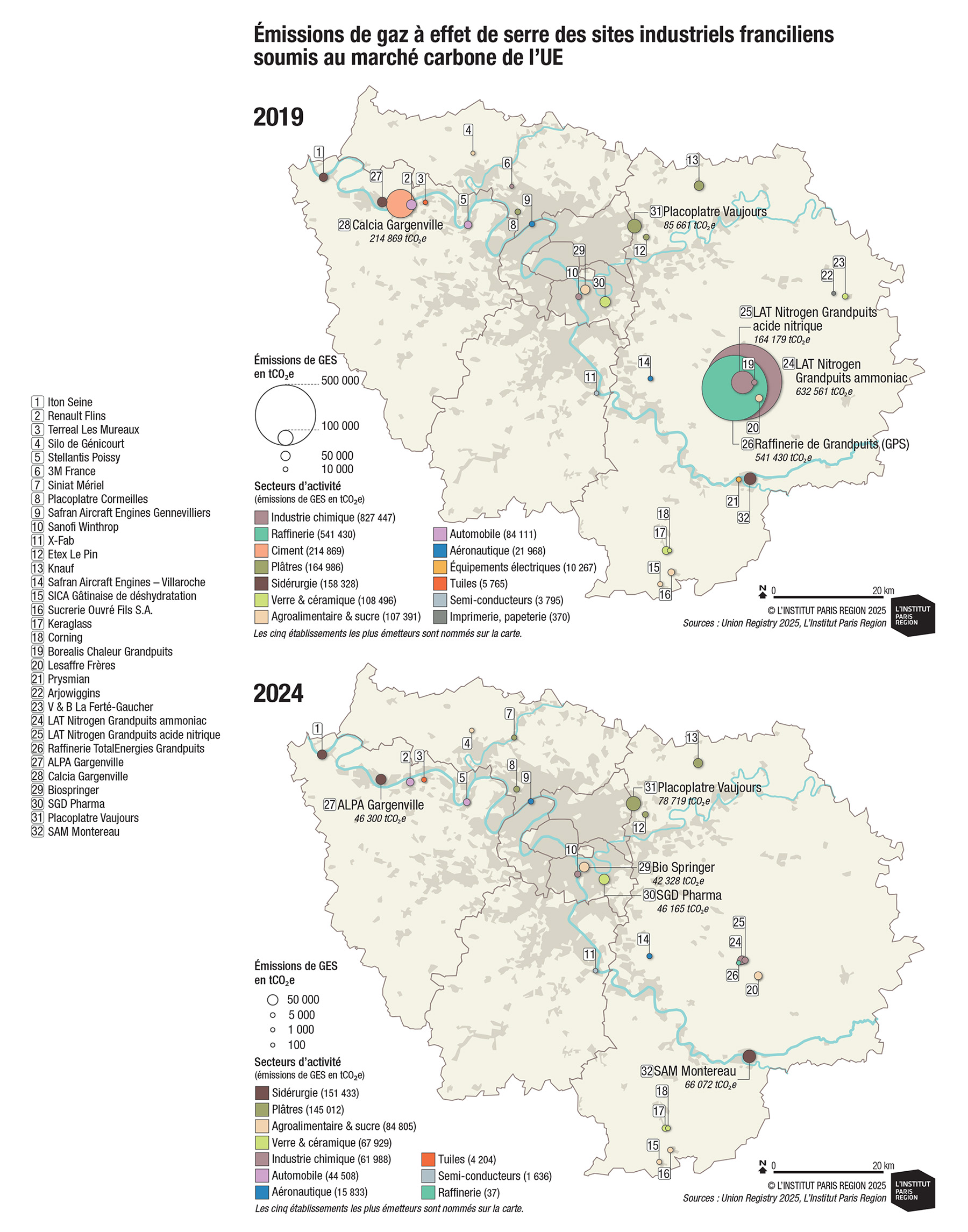 7. Le site industriel francilien le plus émetteur de GES est aujourd’hui l’usine Placoplatre de Vaujours, avec un peu moins de 80 000 tCO2e en 2024.