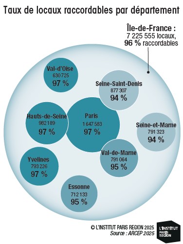En 2025, le bilan est largement positif. Avec un taux moyen de locaux raccordables de 96 %, l’Île-de- France se distingue comme la région la plus fibrée d’Europe occidentale. À titre de comparaison, Amsterdam atteint environ 80 %, Londres vise les 85 %, avec cependant de fortes disparités territoriales, quand Francfort accuse un retard significatif (moins de 50 %). Ce succès est d’autant plus remarquable qu’il s’est accompagné d’une réduction sensible des inégalités territoriales. Alors que, dix ans plus tôt, la fracture numérique entre les zones très denses, concentrant les investissements privés et les territoires de grande couronne, jugés peu rentables, semblait difficile à résorber, le PFTHD a permis une homogénéisation des niveaux de couverture à l’échelle régionale.