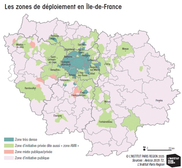 La genèse du PFTHD diffère sensiblement des modèles classiques de planification à la française. Dès le départ, les pouvoirs publics ont fait le choix de privilégier l’initiative privée. Cela s’est traduit par la définition et la délimitation des zones très denses, où la concurrence entre opérateurs s’exerce librement via le déploiement d’infrastructures distinctes. Pour les zones moins denses, un appel à manifestation d’intérêt a été lancé afin d’identifier les opérateurs volontaires pour y déployer leur réseau. En Île-de- France, Orange et SFR se sont ainsi réparti les territoires sur ces zones dites « zones d’initiative privée » ou encore « zones AMII » (zones d’appel à manifestation d’intention d’investissement), chaque opérateur étant responsable du déploiement dans sa zone, avec l’obligation d’ouvrir son réseau aux autres. Les territoires non couverts par l’initiative privée ont ensuite été classés en zones d’initiative publique (ZIP), principalement situées en grande couronne, le déploiement dans ces zones reposant sur un cofinancement entre l’État, la Région et les Départements.