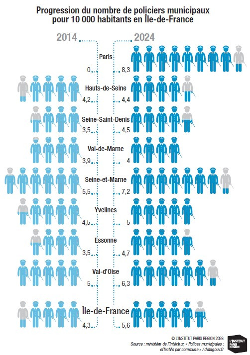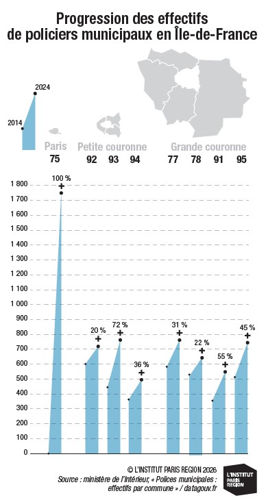 Cette part augmente dans l’ensemble des départements franciliens, atteignant 100 % en Seine-Saint-Denis. Cela étant, son explosion à l’échelle régionale (+45 % sur la période)résulte d’un élément déterminant : la création de la police municipale de Paris, en 2021. En 2024, celle-ci se compose de 1 750 agents, se hissant logiquement au premier rang des plus grandes polices municipales de France, loin devant Marseille (540 agents), Nice (411), Toulouse (390) et Lyon (282). En 2025, elle compte 2 200 agents, et cet effectif devrait se renforcer, d'après les annonces électorales.