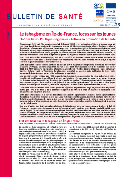 Cette étude, réalisée en partenariat avec l’Agence régionale de santé (ARS) d’Île-de-France, la Ligue contre le cancer et l’Espace Prévention Santé Antéïa propose un état des lieux des données sur les consommations de tabac et un panorama des politiques régionales et d'actions de prévention menées par des acteurs locaux.