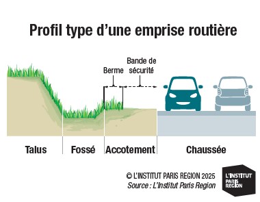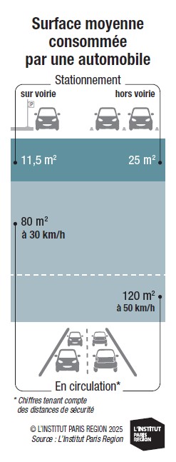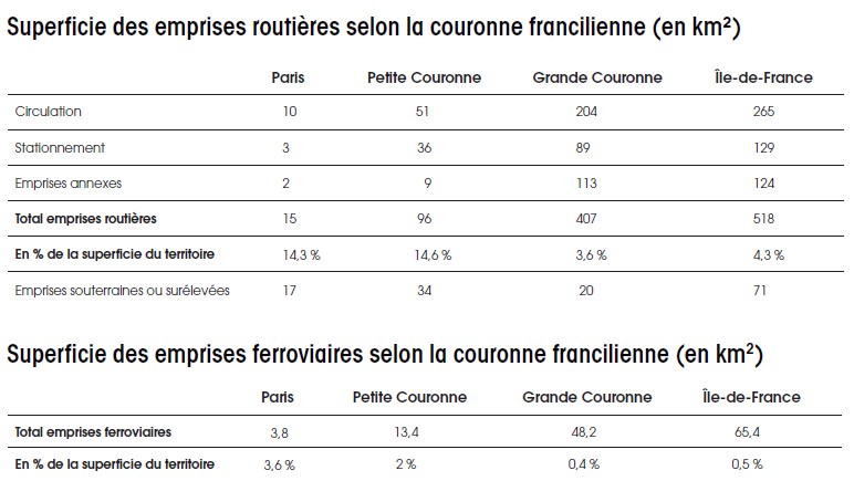 Au total, les espaces dédiés à la circulation routière en Île-de-France (chaussée, hors stationnement) représentent environ 265 km², auxquels il convient d’ajouter environ 124 km² d’espaces annexes (voir schéma plus haut) faisant partie intégrante de l’emprise routière.