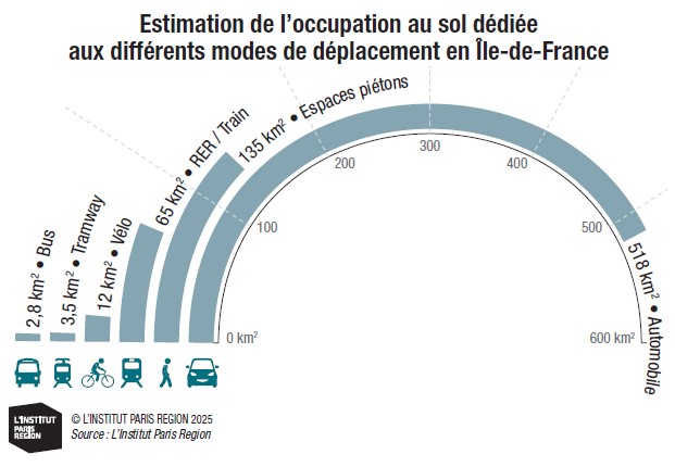 L’efficacité de ces modes varie fortement en s’éloignant du centre de l’agglomération. Pour la route, le besoin en espace par kilomètre parcouru augmente progressivement de 1,8 m² à Paris jusqu’à 4,7 m² en grande couronne. Pour le ferroviaire, cette variation est encore plus marquée, allant de seulement 0,2 m² à Paris à 1,8 m² en grande couronne. Ainsi, le train est neuf fois plus efficace spatialement que la route, à Paris. Cet avantage se réduit progressivement en s’éloignant du centre (le train restant toutefois 2,5 fois plus efficace en grande couronne), traduisant une sous-utilisation relative des infrastructures ferrées en périphérie.