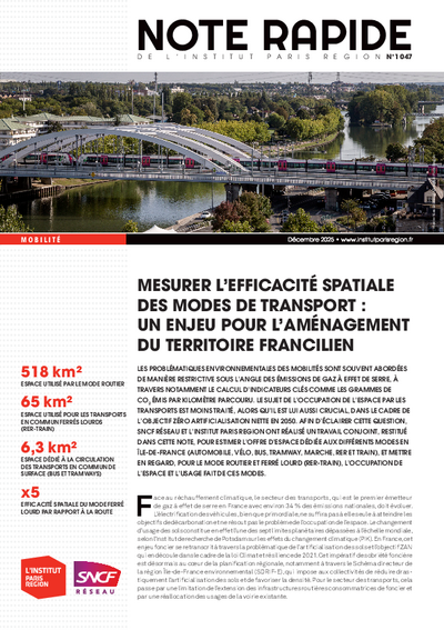 Les problématiques environnementales des mobilités sont souvent abordées de manière restrictive sous l’angle des émissions de gaz à effet de serre, à travers notamment le calcul d’indicateurs clés comme les grammes de CO2 émis par kilomètre parcouru. Le sujet de l’occupation de l’espace par les transports est moins traité, alors qu’il est lui aussi crucial, dans le cadre de l’objectif Zéro artificialisation nette en 2050. Afin d’éclairer cette question, SNCF Réseau et L’Institut Paris Region ont réalisé un travail conjoint, restitué dans cette note, pour estimer l’offre d’espace dédiée aux différents modes en Île-de-France (automobile, vélo, bus, tramway, marche, RER et train), et mettre en regard, pour le mode routier et ferré lourd (RER-train), l’occupation de l’espace et l’usage fait de ces modes.