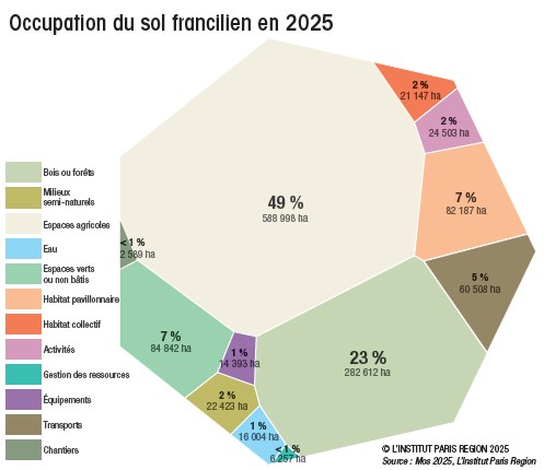 Le millésime 2025 du Mode d’occupation du sol (Mos) accompagne la mise en œuvre du schéma directeur de la région Île-de-France environnemental (SDRIF-E) et de l’objectif Zéro artificialisation nette. Il est marqué par d’importantes innovations : l’exploitation de données satellitaires permettant d’envisager un suivi plus régulier de la consommation d’espace, une granularité renforcée pour une meilleure connaissance des espaces publics et des transports, et une nomenclature enrichie afin de mieux qualifier les emprises dédiées à la gestion des ressources.