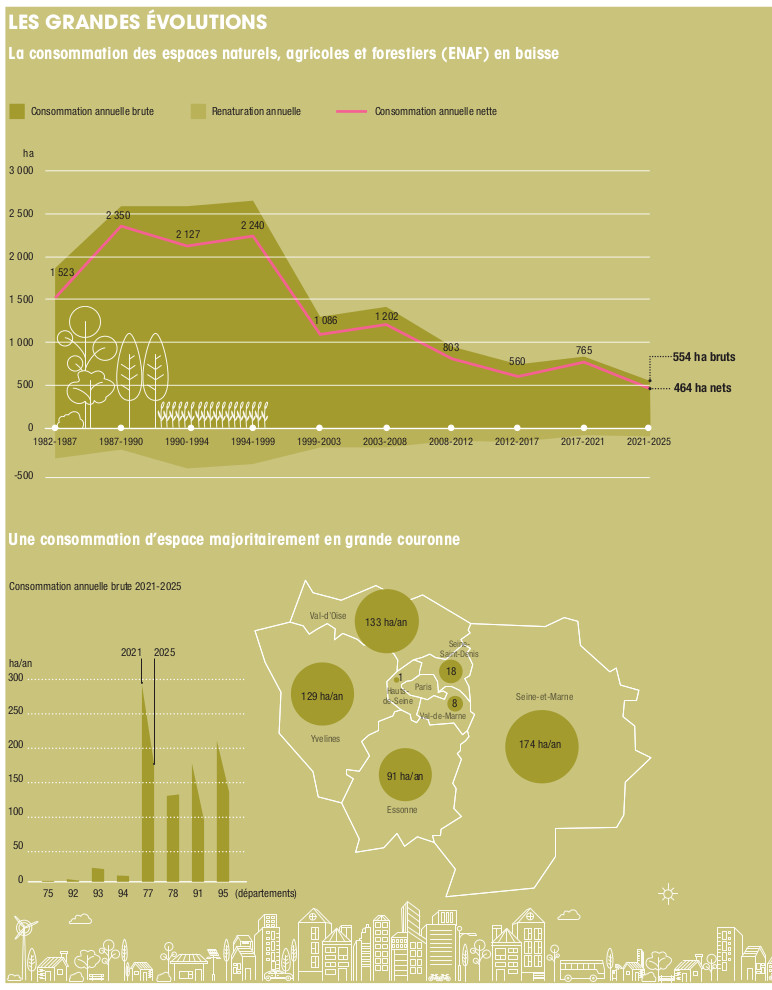 La consommation d’espaces naturels, agricoles et forestiers (ENAF) a atteint, entre 2021 et 2025, son rythme le plus faible jamais observé en Île-de-France. Avec en moyenne 554 hectares consommés par an, c’est 34 % de moins par rapport à la période 2017-2021 ou -28 % en comparaison de la période 2012-2021, qui fait référence au regard de la loi Climat et résilience. Ainsi, les dynamiques observées depuis 2021 placent l’Île-de-France dans le respect du premier objectif de réduction fixé par le SDRIF-E, document de planification régionale approuvé le 10 juin 2025, dont la révision avait débuté en 2021. Ce dernier fixe, pour la période 2021-2031, une trajectoire de consommation à la baisse en comparaison de la décennie 2012-2021 : -23 %, soit 598 ha/an maximum. Si l’on exclut la consommation d’espace ayant eu lieu dans les périmètres de projets d’envergure nationale et européenne (PENE), de l’ordre de 317 hectares au total entre 2021 et 2025 (essentiellement en lien avec les opérations d’intérêt national, le Grand Paris Express et la liaison Roissy-Picardie), la consommation d’ENAF observée sur cette période est en moyenne de 475 hectares par an, soit une réduction de -39 % par rapport à 2012-2021. À mi-parcours de la période 2021-2031, les ambitions de la planification régionale sont, pour le moment, largement respectées. Toutefois, cette dynamique n’empêche pas un possible rebond dans les années à venir, les capacités d’urbanisation du SDRIF-E étant fixées à l’horizon 2040 et restant mobilisables si elles n’ont pas été consommées.