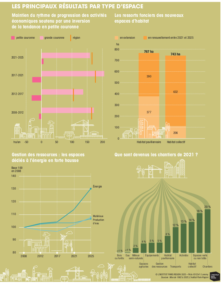Que s’est-il passé en Île-de-France depuis l’adoption de la loi Climat et résilience, en août 2021, qui réaffirmait le principe de sobriété foncière au cœur de l’aménagement du territoire ? Les résultats du Mos 2025 mettent en avant une forte réduction de la consommation des espaces naturels, agricoles et forestiers, s’accompagnant d’une poursuite du renouvellement urbain ; processus majoritaire dans la production de la ville depuis 2008. Les espaces verts ou non bâtis, les activités économiques, et, dans une moindre mesure, l’habitat pavillonnaire s’affirment ainsi comme les nouveaux ressorts fonciers du développement francilien, au bénéfice de l’habitat collectif, qui enregistre non seulement sa plus forte croissance, mais s’affirme également comme l’occupation du sol ayant cru le plus fortement, pour la première fois depuis la création du Mos, en 1982.