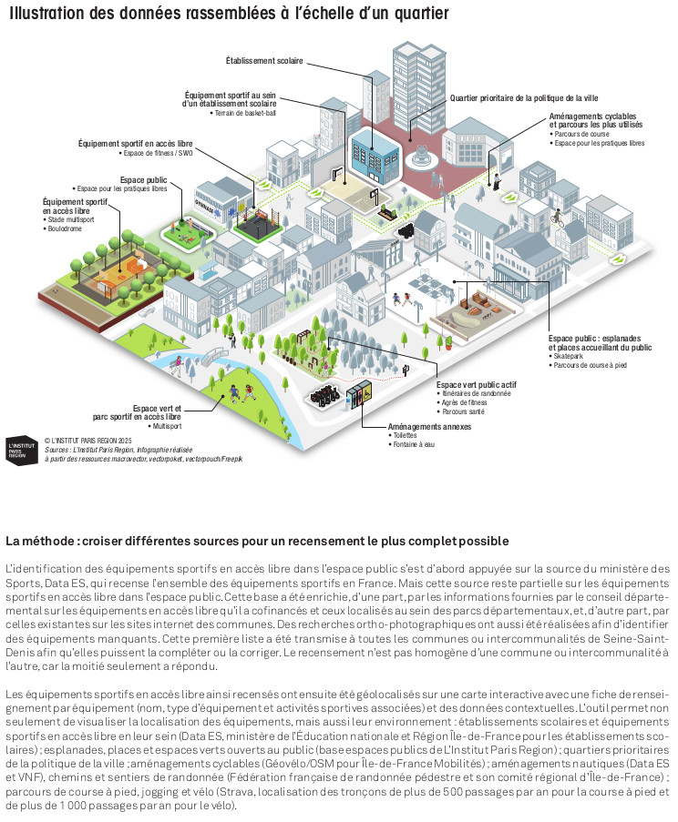 Les équipements sportifs en accès libre ont le vent en poupe : terrains multisports, skateparks, aires de fitness… À côté des équipements plus structurants, comme les gymnases ou les stades, ils complètent l’offre en espaces sportifs d’un territoire. Moins coûteux et moins consommateurs de foncier, ils conduisent à investir l’espace public et à considérer la ville tout entière comme un terrain à aménager pour favoriser la pratique du plus grand nombre. Afin d’appuyer sa politique en faveur d’un espace public plus vivant, inclusif et sportif, le Conseil départemental de Seine-Saint-Denis a engagé un recensement des équipements sportifs en accès libre, mené par L’institut Paris Region. Un exercice inédit.