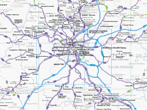 En utilisant les traces GPS des voitures et des camions, la DRIEAT a analysé les flux aux frontières de l’Ile-de-France durant les heures de pointe. La majorité des flux se fait par le Nord et l’Ouest. 14 % des camions ne s’arrêtent pas dans la région. Environ 200 camions franchissent les limites de l’Ile-de-France aux heures de pointe pour rejoindre ou quitter le marché de Rungis.