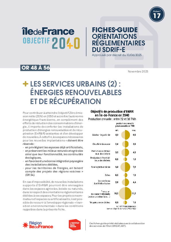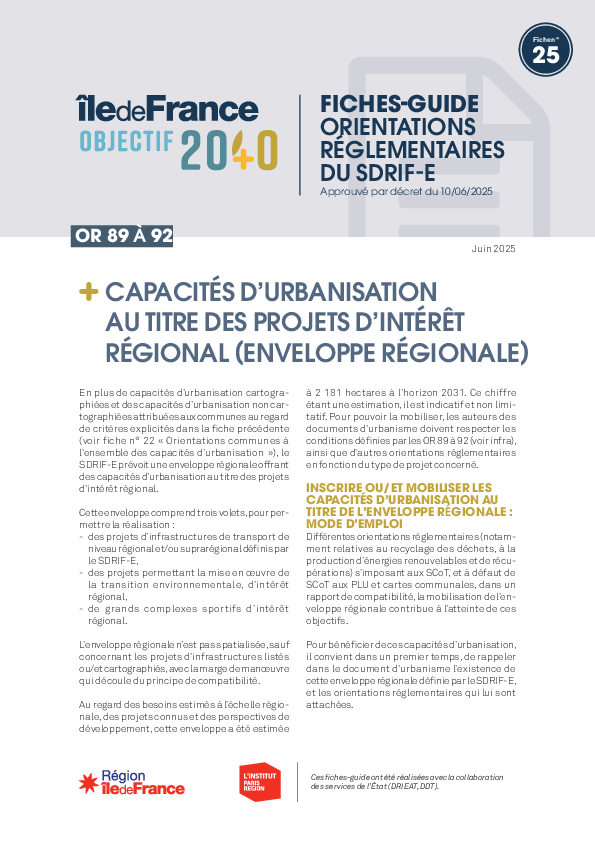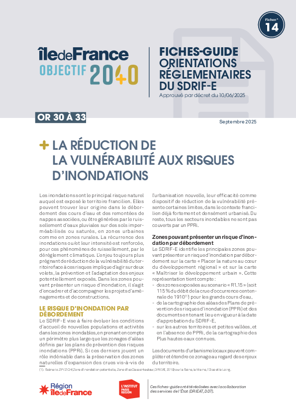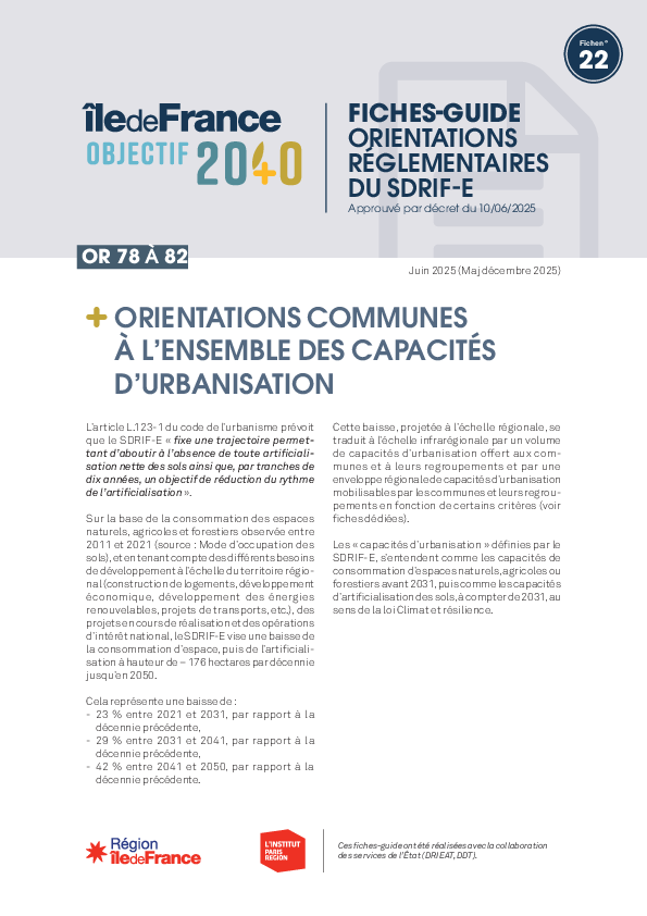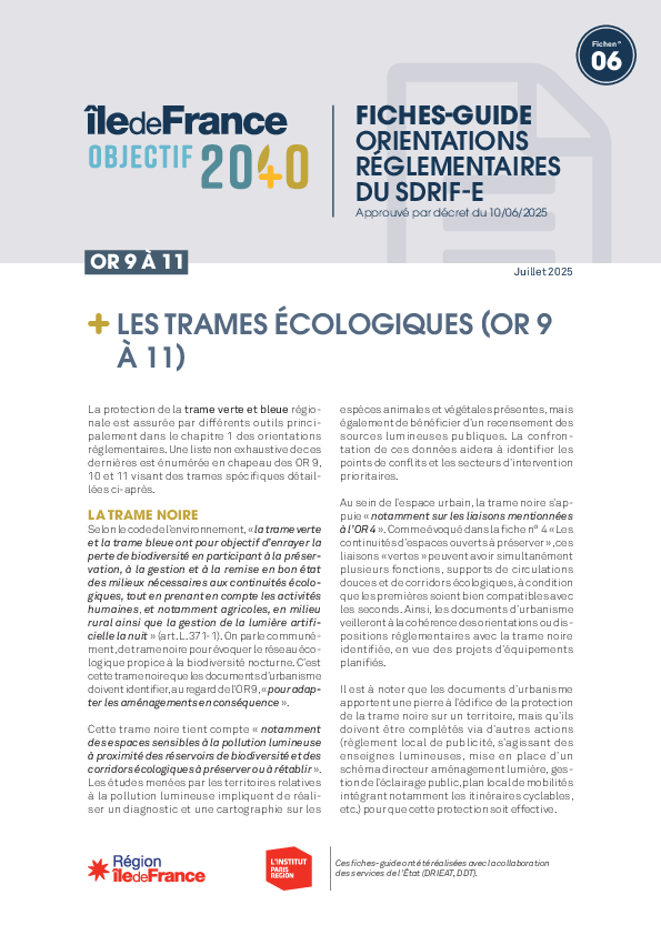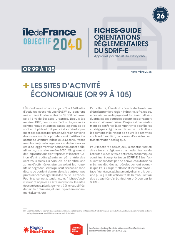Fruit d’une large concertation avec tous les acteurs du territoire, le nouveau Schéma directeur de la Région Île-de-France - Environnemental (SDRIF-E) « Île-de-France 2040 un nouvel équilibre » a été adopté par la délibération du Conseil régional le 11 septembre 2024, puis approuvé, après avis du Conseil d'État, par le décret n° 2025-517 du 10 juin 2025. Ce document détermine l’aménagement de la région d’ici à 2040.